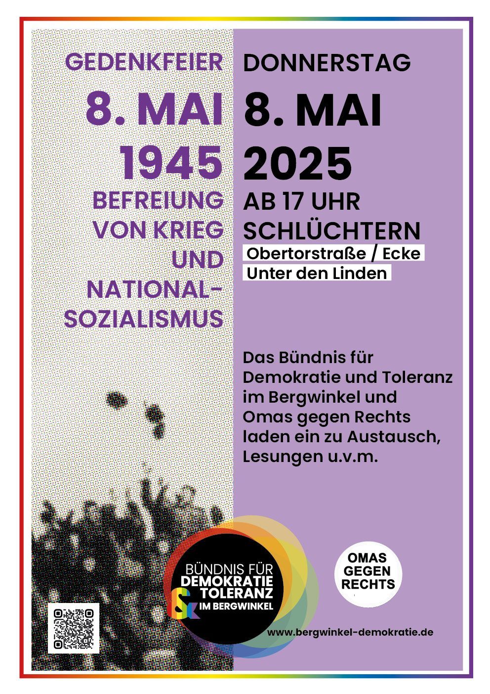 Das Bündnis für Demokratie und Toleranz im Bergwinkel sowie die erst vor wenigen Wochen gegründeten „Omas gegen Rechts“ im Altkreis veranstalteten vor dem Rathaus in Schlüchtern eine Gedenkfeier zum Tag der bedingungslosen Kapitulation Hitlerdeutschlands am 8. Mai. Dieses Datum vor 80 Jahren markiert in Europa das Ende des Zweiten Weltkriegs.